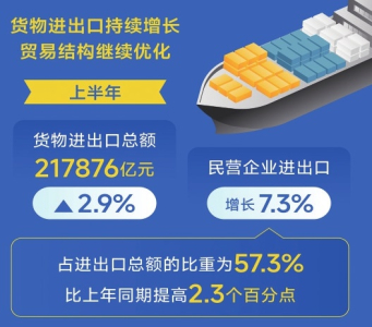 貨物進出口持續(xù)增長,貿(mào)易結構繼續(xù)優(yōu)化。上半年,貨物進出口總額217876億元,同比增長2.9%。民營企業(yè)進出口增長7.3%,占進出口總額的比重為57.3%,比上年同期提高2.3個百分點。