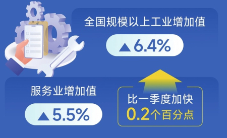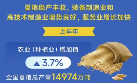夏糧穩(wěn)產(chǎn)豐收,裝備制造業(yè)和高技術制造業(yè)增勢良好,服務業(yè)增長加快。上半年,農(nóng)業(yè)(種植業(yè))增加值同比增長3.7%,全國夏糧總產(chǎn)量14974萬噸;全國規(guī)模以上工業(yè)增加值同比增長6.4%,其中裝備制造業(yè)增加值同比增長10.2%,高技術制造業(yè)增加值增長9.5%,增速分別快于全部規(guī)模以上工業(yè)3.8和3.1個百分點;服務業(yè)增加值同比增長5.5%,比一季度加快0.2個百分點。
