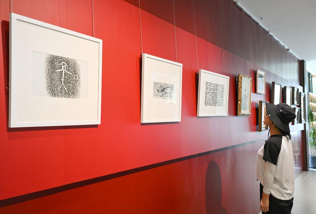 這是在浙江臺州仙居縣白塔鎮(zhèn)上葉村仙居巖畫藝術(shù)中心內(nèi)展出當?shù)貛r畫拓片(7月28日攝)。新華社記者 李賀 攝