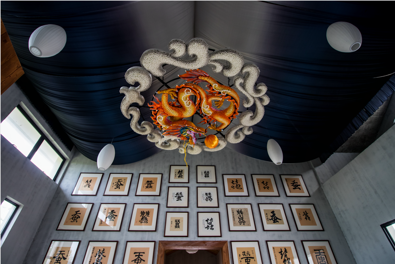 走入云龍村的云龍記憶館,縱使見多識廣,全國主流媒體記者們也依然被盤旋于頂?shù)拇T大金龍震撼到了,紛紛掏出手機(jī)拍個不停:這條金龍是用15000多個蠶繭制作而成,外圍是蠶繭組成的祥云,包裹著里面的金龍,這是云龍村的象征。