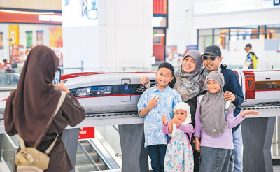 日前,在印度尼西亞雅加達,乘客在雅萬高鐵哈利姆站候車大廳與雅萬高鐵高速動車組模型合影。新華社記者 徐 欽攝