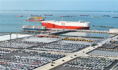 4月27日,搭載7000余輛比亞迪新能源商品車的汽車運輸船比亞迪“深圳”號首航駛往巴西,創(chuàng)下國內汽車單次出口量一個批次最多的紀錄。圖為運輸船正在江蘇省蘇州港太倉港區(qū)裝載汽車。計海新攝(人民視覺)