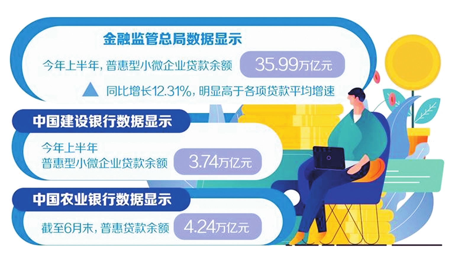 小微企業(yè)是經(jīng)濟(jì)發(fā)展的生力軍、就業(yè)的主渠道、改善民生的重要支撐。金融監(jiān)管總局統(tǒng)計(jì)數(shù)據(jù)顯示,上半年,普惠型小微企業(yè)貸款增長(zhǎng)較快,普惠型小微企業(yè)貸款余額35.99萬億元,同比增長(zhǎng)12.31%,明顯高于各項(xiàng)貸款平均增速。