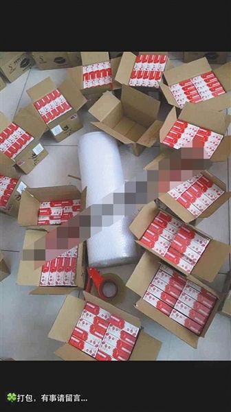 面膜代理商朋友圈中曬出的快遞單及待發(fā)貨物,營造出微商很忙很賺錢的樣子。