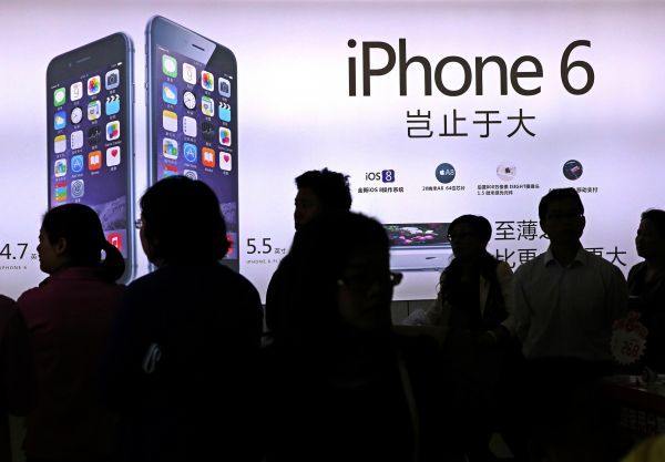 2014年10月17日,顧客在江西南昌的一家蘋(píng)果授權(quán)經(jīng)銷店門(mén)口排隊(duì),等待購(gòu)買(mǎi)iPhone6和iPhone6 Plus手機(jī)。 (新華社發(fā))