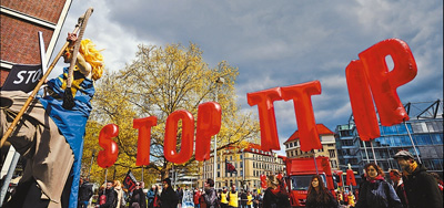 自2013年歐盟和美國啟動《跨大西洋貿(mào)易與投資伙伴關(guān)系協(xié)定》(TTIP)談判以來,歐洲國家的反對和抗議聲不絕于耳。圖為今年4月,德國民眾走上街頭抗議TTIP談判。