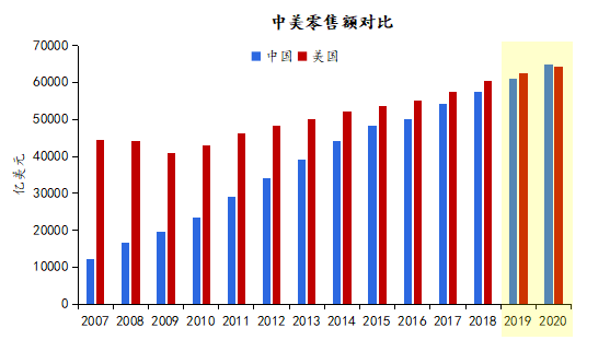 回到當下,在中美貿(mào)易摩擦加劇的背景下,中國也面臨嚴峻的外部環(huán)境變化。但無論如何,堅持改革開放的成功經(jīng)驗都是最重要的應對與出路。未來進一步減少外商投資限制,尤其是服務業(yè)和金融業(yè);繼續(xù)加大資本項目的開放程度;降低關稅以及進口環(huán)節(jié)其他稅收,增加進口;加強知識產(chǎn)權保護,更好的保護外商投資等等既是外部需求,也符合中國自身發(fā)展的需要。 當然,有擔憂認為,大舉開放對中資企業(yè)不利,或者沒有給與中資企業(yè)足夠的緩沖期,但筆者認為,引入競爭機制對于國內(nèi)企業(yè)而言危中有機,改變制度優(yōu)勢下的坐享其成,在競爭中提升國內(nèi)企業(yè)全球競爭力,是中國企業(yè)進一步走向國際市場的需求。而從中國對外開放的實踐來看,入世后,外資銀行在中國的資產(chǎn)規(guī)模占比先增后降,其實體現(xiàn)的是中國企業(yè)適應國際化,自我求變的過程,未必是壞事。 發(fā)掘積極因素 釋放潛在動能 更進一步,與以往相比,中國經(jīng)濟基本面存在不少積極因素,這使得在面臨外部壓力之時,中國經(jīng)濟有更強的韌性。 首先,國內(nèi)消費市場潛力巨大。中國零售市場規(guī)模從十年前只有美國市場份額的四分之一,到2018年已接近美國市場份額,預計2019年中國很有可能超過美國,成為世界第一大零售市場。與此同時,伴隨著居民收入水平提升,居民醫(yī)療、旅游、教育文娛等服務類消費占比提升,食品、衣著等必需品消費占比下降;而且高端消費品、海外購物旺盛等現(xiàn)象出現(xiàn),說明中國消費呈現(xiàn)升級態(tài)勢。疊加減稅降費政策的實施,預期未來中國消費市場潛力會進一步釋放。 圖表2 中國零售額有望趕超美國,成為世界第一