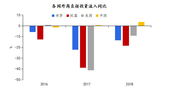 其次,新經(jīng)濟蓬勃發(fā)展。移動支付、大數(shù)據(jù)、云計算、“互聯(lián)網(wǎng)+”等帶動產(chǎn)業(yè)革命與產(chǎn)品創(chuàng)新。例如,中國移動支付應用領先于全球水平,當前中國第三方移動支付的滲透率已高達九成,極大降低了交易成本并提高了經(jīng)濟運行效率;人工智能發(fā)展迅速,中國機器人產(chǎn)業(yè)規(guī)模保持年均20%的高速增長,中國工業(yè)機器人產(chǎn)量占全球產(chǎn)量的三分之一;互聯(lián)網(wǎng)消費快速增長,2018年全國網(wǎng)上零售同比增長23.9%,遠高于同期社會傳統(tǒng)零售9%左右的增長率;研發(fā)經(jīng)費支出快速增長,2018年已經(jīng)達到近2萬億的水平,研發(fā)投入強度(研發(fā)支出占名義GDP比重)也升至2.18%,在發(fā)展中國家中處于絕對領先水平??梢哉f,新經(jīng)濟正在改變傳統(tǒng)的商業(yè)模式與業(yè)態(tài),成為新時期中國經(jīng)濟的重要推動力,大大提升了經(jīng)濟增長的韌性。 再次,改革進入深入?yún)^(qū)。十九大報告提出,不平衡不充分的發(fā)展是當前中國面臨的突出問題,政策重點應由強調(diào)高速增長向高質(zhì)量發(fā)展轉(zhuǎn)變,這為未來中國經(jīng)濟發(fā)展指明了方向。2019年二季度政治局會議也明確提出,堅持以供給側(cè)結(jié)構性改革為主線,堅持新發(fā)展理念、推動高質(zhì)量發(fā)展,堅持推進改革開放。在此框架下,利率市場化改革、房地產(chǎn)長效機制建設、資本市場制度建設、三塊地、財稅體制改革等均在加快。 最后,加快推動對外開放。2018年,在保護主義抬頭的大背景下,全球主要經(jīng)濟體外商直接投資均呈現(xiàn)負增長,而中國吸引的FDI穩(wěn)中有升,表明近年來我國開放政策效果顯著。近一段時間,金融業(yè)對外開放步伐也明顯加快,如7月20日,國務院金融穩(wěn)定發(fā)展委員會辦公室發(fā)布11條金融業(yè)對外開放措施,涉及債券市場、銀行保險市場和證券市場三個領域,內(nèi)容涵蓋了外資金融機構參與國內(nèi)金融市場業(yè)務的眾多實質(zhì)性變化,如開放時點前移、準入限制放寬等,顯示了中央推動金融開放進程“宜快不宜慢、宜早不宜遲”的決心。 圖表3 中國吸引外商投資穩(wěn)中有升,而全球主要經(jīng)濟體均為負增長