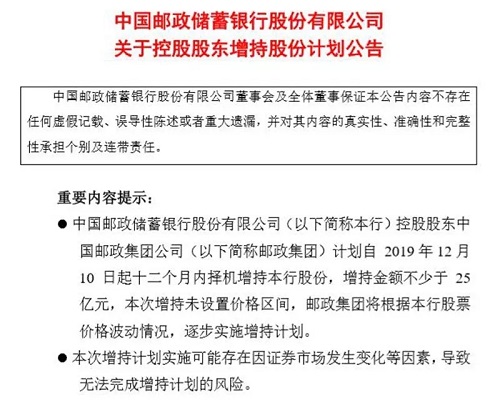 備受市場關(guān)注的是,同日,郵儲銀行還發(fā)布了《關(guān)于控股股東增持股份計劃公告》。公告稱,控股股東中國郵政集團公司(下稱郵政集團)計劃自2019年12月10日起12個月內(nèi)擇機增持該行A股股份,增持金額不少于25億元。這體現(xiàn)了控股股東對郵儲銀行投資價值的高度認可,也將為證券市場的穩(wěn)定運行創(chuàng)造良好環(huán)境,彰顯“國家隊”擔(dān)當(dāng)。