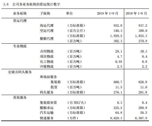 從公司各業(yè)務板塊運營情況來看,2019年1-9月,中國外運各版塊業(yè)務量同比增幅較小,其中不乏較上年同比下降的情況。例如,貨運代理中的空運代理、專業(yè)物流中的合同物流、項目物流,倉儲及碼頭服務中的庫場站服務散貨、碼頭服務等具體業(yè)務的貨運量較2018年同期相比均有所下降。