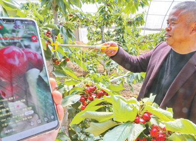 4月9日,秦皇島市海港區(qū)海陽鎮(zhèn)鯉泮莊村的祺和大櫻桃種植基地內(nèi),村民蘇士明使用網(wǎng)絡(luò)平臺直播推銷大櫻桃。 人民視覺