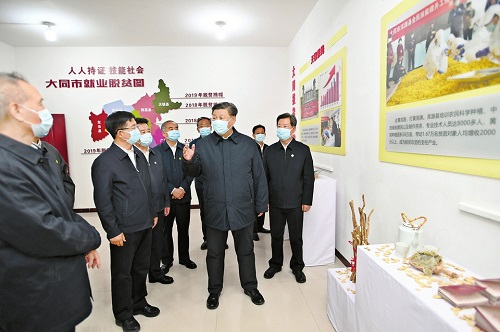 5月11日下午,習近平走進云州區(qū)西坪鎮(zhèn)坊城新村技能培訓服務站,了解新村易地扶貧搬遷情況。 新華社發(fā)