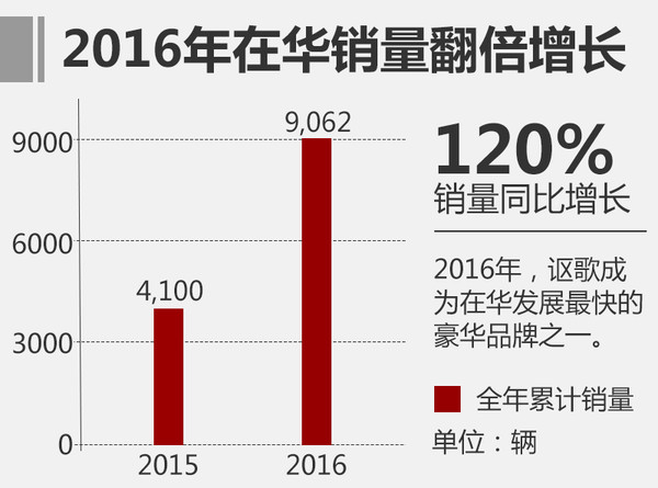 由于此前在華的產(chǎn)品投入等多方問(wèn)題,入華已經(jīng)達(dá)到10年的本田高端品牌謳歌,銷量并沒有得到顯著提升,2015年謳歌在中國(guó)市場(chǎng)的新車上牌量?jī)H為4,100輛,數(shù)據(jù)并不美麗。2016年謳歌重整旗鼓,制定完善的在華戰(zhàn)略,推出首款國(guó)產(chǎn)車型CDX后其銷量得到明顯提升,2016年累計(jì)售出9,062輛,同比大增120%,成為增速第二快的豪華品牌。