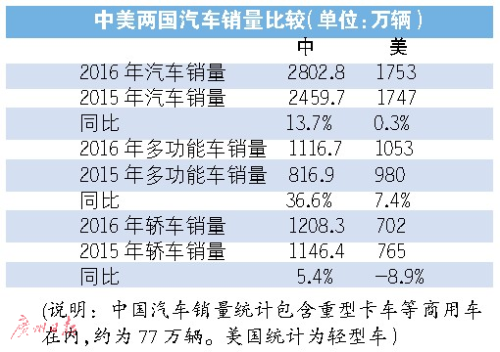 不被看好的2016年車市,在上半年“低開”之后,硬是憑借下半年的“高走”,實現(xiàn)全年逆襲。2016年,中國車市交出漂亮成績單,全年產(chǎn)銷分別完成2811.9萬輛和2802.8萬輛,比上年同期分別增長14.5%和13.7%,高于上年同期11.2和9.0個百分點。這一成績單,讓中國車市毫無懸念蟬聯(lián)全球第一大市場寶座,并再創(chuàng)歷史新高,自2009年超越美國成為全球第一大市場之后,中國再未讓這頭銜旁落。2016年,盡管美國市場創(chuàng)出1753萬輛的新高,但與中國差距已經(jīng)拉大至1049萬輛。