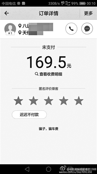 在某網(wǎng)站論壇上,一名順風(fēng)車司機(jī)爆料說,晚上下班后接了一單滴滴順風(fēng)車,想著反正順路,上班路上接一單抵個(gè)油費(fèi)也是好的。送到目的地后,自己出于習(xí)慣讓乘客先下車后付款,沒想到對(duì)方是用小號(hào)注冊(cè)的滴滴賬戶,晚飯后再打電話已經(jīng)是“空號(hào)”?!斑@顯然是惡意打霸王車啊?!?/p>