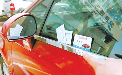 車窗上被插上各種名片式的小廣告,盡管令很多車主不勝其煩,但大家也多是取下來直接扔掉,沒太當回事,而車主王先生卻因此花了幾百元的修車錢。