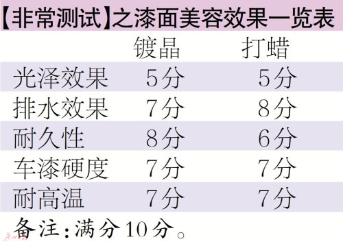 車天下君在兩塊車身試驗(yàn)面板上進(jìn)行測(cè)試,一塊鍍晶,一塊打蠟。全部按照說(shuō)明書(shū)手工操作。車天下君是個(gè)理工男,做這些事情還算是輕車熟路。完工對(duì)比光澤效果,在都沒(méi)有拋光處理的情況下,鍍晶和打蠟都沒(méi)有起到提升漆面光澤的效果,給予“不及格”的差評(píng)。潑上水,漆面都形成水珠,但仔細(xì)比較,會(huì)發(fā)現(xiàn)打蠟的排水效果比鍍晶要好。