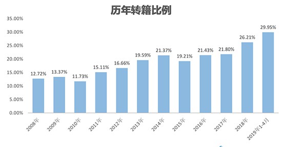 4月全國(guó)二手車市場(chǎng)交易量為120.06萬輛,環(huán)比下降4%,同比增長(zhǎng)4.29%;1-4月,二手車?yán)塾?jì)銷售445.63萬輛,同比增長(zhǎng)2.61%,跨城市交易額比例達(dá)到29.95%。羅磊表示,隨著全國(guó)各區(qū)域二手車流通的壁壘逐步消除,二手車全國(guó)自由流通越來越快捷,這一利好因素促使國(guó)內(nèi)二手車交易轉(zhuǎn)籍比例在過去10年里呈逐年上升趨勢(shì)。