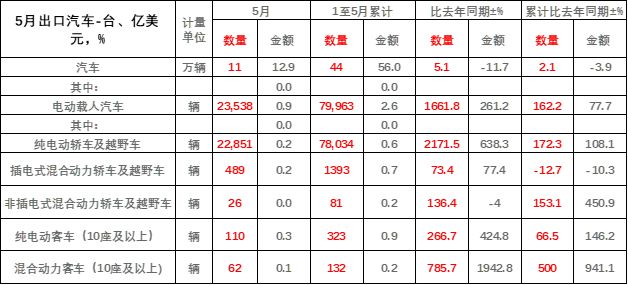5月,我國(guó)出口汽車(chē)10.6萬(wàn)輛,同比增長(zhǎng)5.1%。其中,新能源汽車(chē)出口2.35萬(wàn)輛,同比增長(zhǎng)1661.8%。崔東樹(shù)認(rèn)為,新能源汽車(chē)對(duì)車(chē)市實(shí)現(xiàn)高質(zhì)量增長(zhǎng)具有一定的拉動(dòng)作用,同時(shí)也是國(guó)內(nèi)汽車(chē)出口實(shí)現(xiàn)正增長(zhǎng)的強(qiáng)大動(dòng)力。