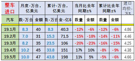 從進(jìn)口額來(lái)看,5月汽車(chē)進(jìn)口額為46.5億美元,同比增長(zhǎng)4.6%;1-5月,汽車(chē)進(jìn)口額為197.2億美元,同比下降6.3%。