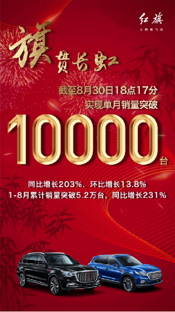 2019年8月30日18點(diǎn)17分,據(jù)紅旗官宣,紅旗品牌單月銷量已突破10000輛,同比增長203%,環(huán)比增長13.8%,至此,1-8月累計(jì)實(shí)現(xiàn)銷量5.2萬輛,同比增長231%。單月突破10000輛的成績,使紅旗首次躋身月銷萬輛俱樂部,這一極具里程碑意義的銷量數(shù)字,讓紅旗進(jìn)入了主流豪華品牌陣營,書寫了紅旗誕生61年來新的紀(jì)錄,也驗(yàn)證了紅旗正以氣貫長虹的勇猛之勢,實(shí)現(xiàn)著全方位的“跨越”。