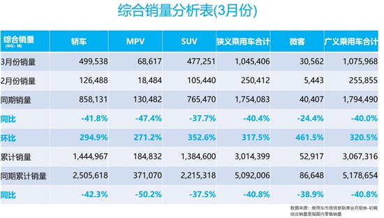 轎車3月售出499538輛,同比下滑41.8%,環(huán)比增長294.9%;1季度轎車共售出1444967輛,同比下滑42.3%。MPV則“借”疫情之勢繼續(xù)墜落,3月共售出68617輛,同比下滑47.4%;1季度,共售出184832輛,下滑幅度超過50%。