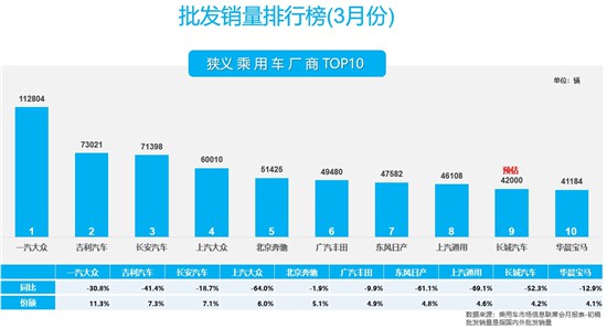 分不同級(jí)別市場來看,受換購市場興旺推動(dòng),高檔品牌表現(xiàn)依舊突出,3月,高檔品牌銷量同比“僅”下滑20%;尤其以批發(fā)量來看,北京奔馳高居廠商批發(fā)量第5名,華晨寶馬同樣擠進(jìn)前十,體現(xiàn)出了廠家、經(jīng)銷商對后市的絕對信心。主流合資品牌中,德系品牌份額擴(kuò)大4.4%,而日系品牌則下滑1.9%。
