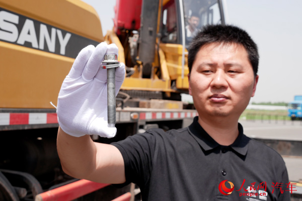 現(xiàn)場,工作人員演示將一顆螺栓從一輛行駛5萬公里的實驗車上拆下一顆重164克、長112.9毫米的螺栓。隨后,將該螺栓作為受力點固定,借助吊機,將重達10噸的房子吊起2米高度,停留5分鐘后,螺栓不變形、不磨損。