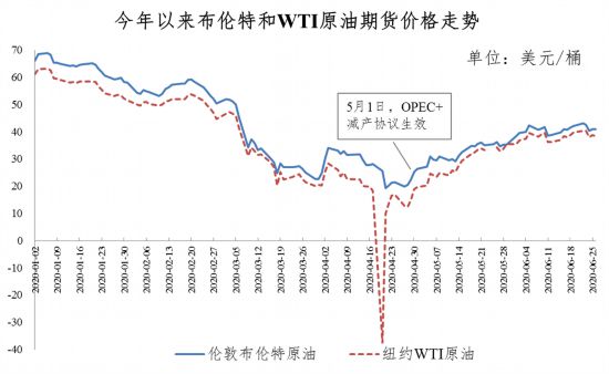 其中,4月20日紐約WTI原油5月合約臨近交割前甚至跌至每桶-37.63美元的負(fù)值。極低油價給沙特、俄羅斯等主要產(chǎn)油國帶來沉重壓力,并促使各方達(dá)成新一輪歷史性最大力度減產(chǎn)協(xié)議。隨著5月OPEC+正式推進(jìn)減產(chǎn),美國等產(chǎn)油國在低油價下產(chǎn)量也出現(xiàn)下降,以及更多海外國家放寬疫情管制,需求預(yù)期得到改善,國際油價逐步回升。目前,倫敦布倫特和紐約WTI油價升至每桶41美元和39美元的水平。