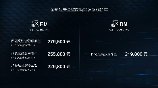 7月12日,比亞迪宣布“全球超安全智能新能源旗艦轎車”漢正式上市,上市車型包含三款漢EV和一款漢DM。全國綜合補貼后,漢EV超長續(xù)航版豪華型售價22.98萬元、漢EV超長續(xù)航版尊貴型售價25.58萬元、漢EV四驅(qū)高性能版旗艦型售價27.95萬元;漢DM四驅(qū)性能版豪華型售價21.98萬元。