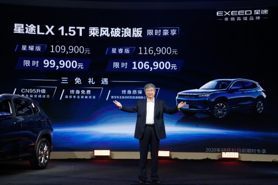 奇瑞汽車股份有限公司黨委書記、董事長尹同躍現(xiàn)場宣布了一項“長期福利”:即日起至10月31日,星途LX 1.5T乘風(fēng)破浪版限時售價9.99萬元起、還可享CN95空濾免費升級、首任車主基礎(chǔ)流量終身免費、首任車主發(fā)動機(jī)及變速箱核心零部件終身質(zhì)?!叭舛Y包”。