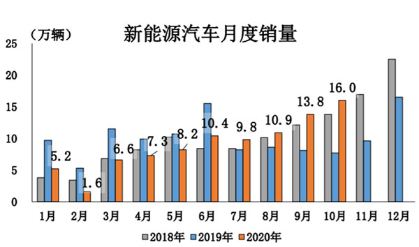 10月,新能源汽車產(chǎn)銷分別完成16.7萬輛和16萬輛,同比分別增長69.7%和104.5%,其單月產(chǎn)銷第四次刷新了當月歷史記錄。從細分能源類型來看,其中純電動汽車產(chǎn)銷分別完成14.1萬輛和13.3萬輛,同比分別增長72.4%和115.4%;插電式混合動力汽車產(chǎn)銷分別完成2.6萬輛和2.7萬輛,同比分別增長56.7%和63.7%;燃料電池汽車產(chǎn)銷分別完成77輛和79輛,同比分別增長1.3%和4.0%。