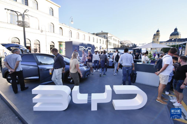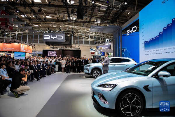 這是9月4日在德國慕尼黑國際車展媒體預展上拍攝的比亞迪發(fā)布會現(xiàn)場。