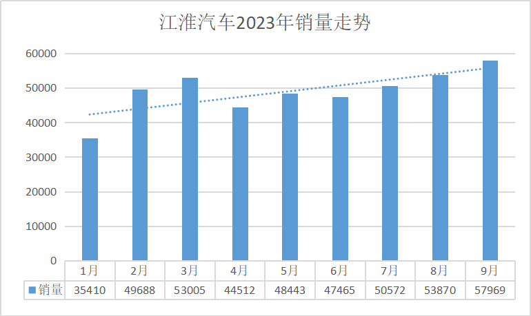 2023年10月10日,安徽江淮汽車集團(tuán)股份有限公司(以下簡稱“江淮汽車”)發(fā)布《安徽江淮汽車集團(tuán)股份有限公司2023年9月產(chǎn)、銷快報》??靾箫@示:2023年9月,江淮汽車銷量為5.80萬輛,同比增長21.59%,連續(xù)8個月實(shí)現(xiàn)同比正增長;1-9月累計銷售44.12萬輛,同比增長18.70%。