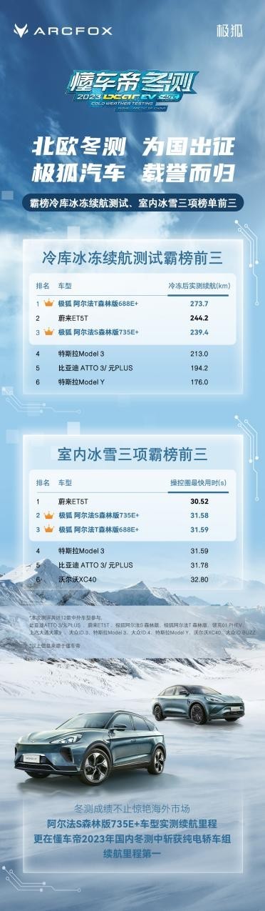 值得一提的是,就在剛剛結束的2023懂車帝冬測中,極狐汽車憑借優(yōu)異的表現(xiàn)驚艷國內及海外市場。其中,參賽車型阿爾法S森林版735E+,以368.8的實測續(xù)航里程在國內冬測中取得純電轎車組續(xù)航里程第一名的好成績。而阿爾法T森林版688E+、阿爾法S森林版735E+在北歐冬測中,更是以驚人的表現(xiàn),實力霸榜冷庫冰凍續(xù)航測試、室內冰雪三項榜單前三,向世界展現(xiàn)了中國新能源汽車的卓越品質。