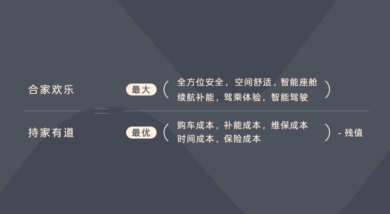 另一點(diǎn)專注放在用戶的核心需求上,這需要產(chǎn)品呈現(xiàn)——話筒交給了他,他用了一個(gè)家庭用車價(jià)值公式,將產(chǎn)品作為一個(gè)分?jǐn)?shù),其中分子體驗(yàn)價(jià)值的最大化,分母是擁車成本的最優(yōu)化。