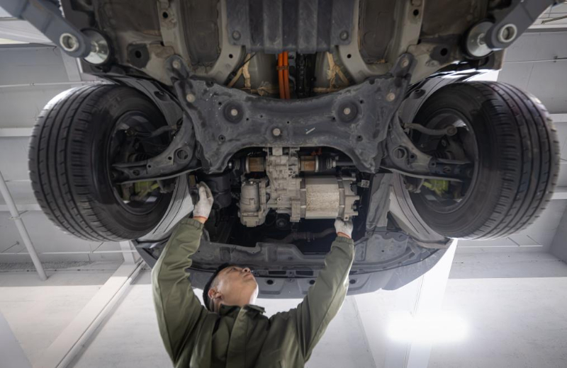 12月5日,一名新能源汽車(chē)維修師在檢查一輛新能源汽車(chē)的電機(jī)。新華社記者 肖藝九 攝