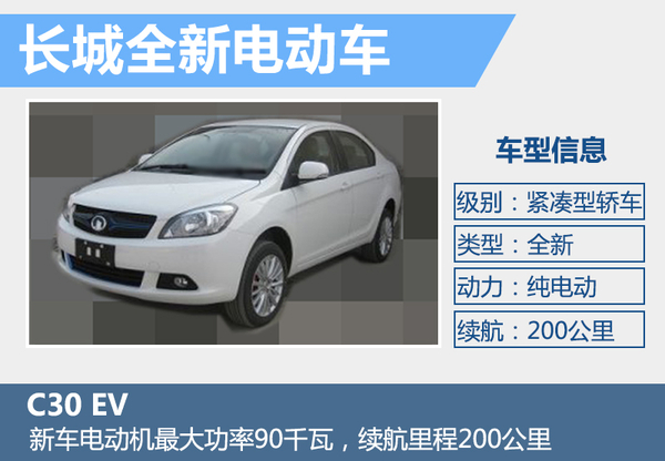 根據(jù)長(zhǎng)城汽車(chē)此前公布消息,旗下首款純電動(dòng)轎車(chē)將于2016年上市。網(wǎng)通社獲得了一組長(zhǎng)城全新電動(dòng)車(chē)型C30 EV的諜照及部分信息,新車(chē)外觀方面較燃油版車(chē)型在細(xì)節(jié)方面進(jìn)行調(diào)整,加入更多“EV”元素。新車(chē)搭載一臺(tái)功率為90千瓦的電動(dòng)機(jī),續(xù)航里程有望達(dá)到200公里。