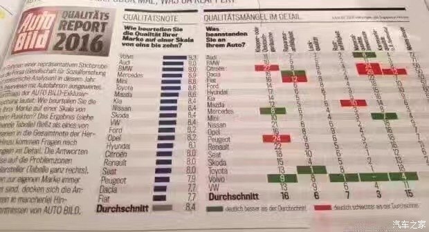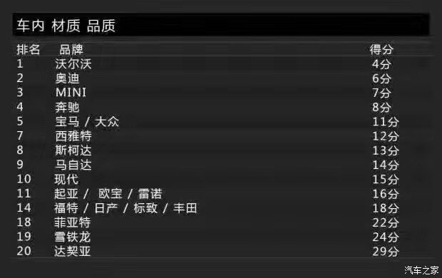 接下來說的這個(gè)話題也許是大家比較關(guān)心的,那就是車內(nèi)材質(zhì)品質(zhì),說白了就是用料。我們知道,很多消費(fèi)者在新房裝修完畢后都會(huì)過一段時(shí)間再入住,目的就是讓裝修時(shí)新材料附帶的甲醛消散干凈,這可關(guān)乎到健康。汽車同樣面臨這個(gè)問題,如果用料不夠好不夠環(huán)保的話,車內(nèi)就會(huì)出現(xiàn)不良異味。說到這里,我們看看德國消費(fèi)者對汽車品牌車內(nèi)材質(zhì)品質(zhì)的滿意度。 近來把北歐奢華風(fēng)發(fā)揮至極致的沃爾沃同樣表現(xiàn)不差,在瑞典人注重用料的堅(jiān)持下得到最多德國人青睞,在所有汽車品牌中滿意度最高。第二名則是奧迪,得分為6分,而MINI竟然贏過奔馳得了第三,寶馬及大眾則列居第五。而滿意度最低的則是達(dá)契亞,它的得分為29分。那么問題來了,坐在達(dá)契亞里面的車主與活在霾底下的人,誰更幸福?