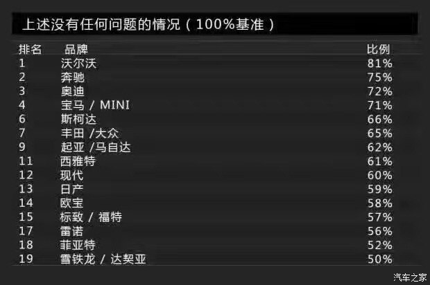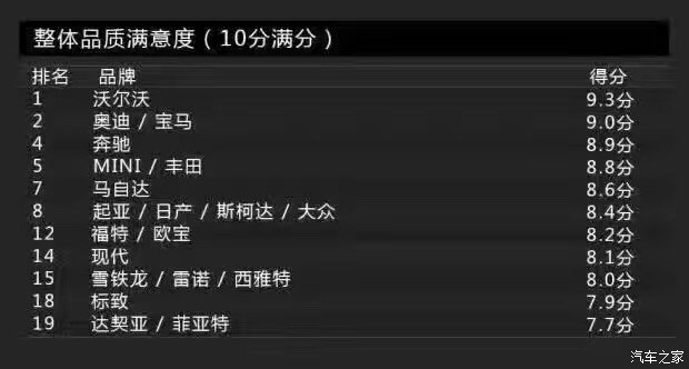 Auto Bild這次的品質(zhì)調(diào)查主要圍繞車身品質(zhì)(接縫)、涂裝品質(zhì)、車內(nèi)材質(zhì)品質(zhì)、耐生銹品質(zhì)、車內(nèi)靜音品質(zhì)等方面對消費(fèi)者進(jìn)行調(diào)研,并進(jìn)行了高達(dá)8600名進(jìn)行了抽樣問券。消費(fèi)者對以上方面全部滿意的比例占比中,沃爾沃高居榜首,它的整體滿意度高達(dá)81%,比排名第二的奔馳高出6個(gè)百分點(diǎn),整體品質(zhì)得分更是高達(dá)9.3分(滿分10分)。 表現(xiàn)最不好的則是雪鐵龍和達(dá)契亞,占比與得分分別為50%和7.7分。雪鐵龍不多說,老相識了,重點(diǎn)說下達(dá)契亞(Dacia),也許部分網(wǎng)友對達(dá)契亞不是很熟悉,這個(gè)一度進(jìn)入國內(nèi),并留給人們不少回憶的品牌,在這次的調(diào)查報(bào)告中表現(xiàn)最不好的就是它了,相信看完這篇文章后你會(huì)熟悉它的,說不定還上了你的黑名單。(小編科普一下:達(dá)契亞是羅馬尼亞最大的汽車廠商,在1999年被法國雷諾收購,目前這個(gè)品牌已經(jīng)退出中國市場。)