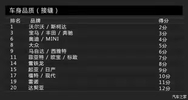 再來看看涂裝品質(zhì)方面,涂裝主要包括車漆亮度與耐腐蝕性。還是老規(guī)矩,得分最低就代表消費(fèi)者滿意度最高(下同)。沃爾沃的得分為1分,依然占據(jù)榜首的位置,或許排名第二的奔馳為4分,但跟沃爾沃差距有點(diǎn)大。得分最高的則是歐寶,為9分。另外,達(dá)契亞也有8分。