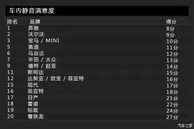 如果說音響發(fā)燒是一門玄學(xué),那汽車的車內(nèi)靜音真是一門實(shí)實(shí)在在考驗(yàn)功底的技術(shù)流。車內(nèi)靜音要考慮風(fēng)阻噪音、輪胎噪音、不同接縫處的噪音、發(fā)動(dòng)機(jī)震音等多種復(fù)雜的情況。因此很多汽車廠商在處理車內(nèi)靜音的時(shí)候并不是很拿手。 在Auto Bild這次調(diào)查的車內(nèi)靜音品質(zhì)上,排名第一的是奔馳,它的得分為8分,而排在第二名的則是沃爾沃,它的得分為9分。寫到這里,小編不得不說:老哥,真穩(wěn),服!滿意度最低的則是雪鐵龍,又是法國車企,Auto Bild你還能不能一起好好玩耍了!