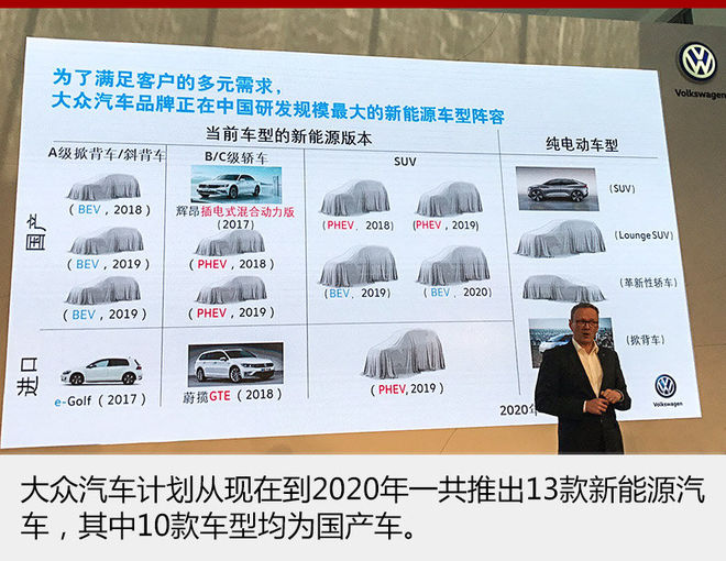 從這張規(guī)劃圖中能夠看到,至2020年大眾汽車在中國新推出13款新能源車,其中有10款車型會(huì)在國內(nèi)進(jìn)行本土化生產(chǎn)。加上已上市的e-UP!和高爾夫GTE,大眾在華新能源車陣容將增至15款。另外,進(jìn)口引入的e-Golf和上汽大眾輝昂插電混動(dòng)版將于年內(nèi)率先投入市場。