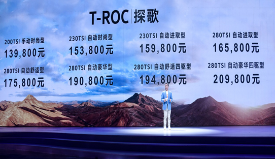 7月30日, 一汽-大眾首款SUV——T-ROC探歌在深圳上市。新車提供200TSI、230TSI和280TSI三款動力選擇,并提供四驅(qū)版本,共8款車型,售價(jià)區(qū)間13.98-20.98萬元。