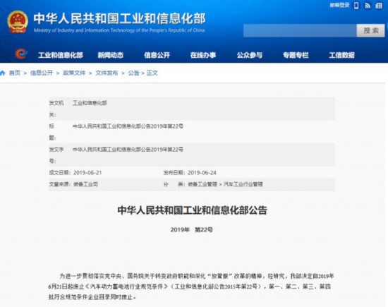 6月24日,工信部正式發(fā)布了一則公告,明確表示自今年6月21日起,廢止《汽車動(dòng)力蓄電池行業(yè)規(guī)范條件》(工業(yè)和信息化部公告2015年第22號(hào)),同時(shí)廢止的還有第一、第二、第三、第四批符合規(guī)范條件企業(yè)目錄。全國(guó)乘用車市場(chǎng)信息聯(lián)席會(huì)秘書長(zhǎng)崔東樹在接受《中國(guó)汽車報(bào)》記者采訪時(shí)表示,此舉意味著,在業(yè)內(nèi)存在近4年的新能源汽車動(dòng)力電池“白名單”正式取消,國(guó)內(nèi)動(dòng)力電池領(lǐng)域?qū)⒂瓉?lái)新一輪的競(jìng)爭(zhēng)。