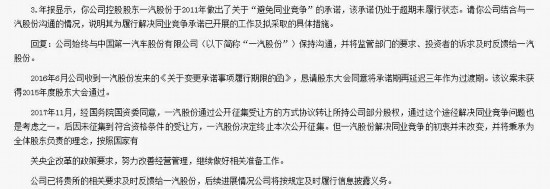 2011年6月,一汽股份成立之初,曾向一汽轎車(chē)和一汽夏利作出不可撤銷(xiāo)承諾:在一汽股份成立后五年內(nèi)通過(guò)資產(chǎn)重組或其他方式整合所屬的轎車(chē)整車(chē)生產(chǎn)業(yè)務(wù),以解決同業(yè)競(jìng)爭(zhēng)問(wèn)題。但五年過(guò)去了,這一問(wèn)題并未得到解決,在2016年6月28日,一汽轎車(chē)和一汽夏利同時(shí)發(fā)布公告稱(chēng),一汽股份原計(jì)劃在五年內(nèi)解決其與子公司一汽轎車(chē)、一汽夏利同業(yè)競(jìng)爭(zhēng)的承諾無(wú)法履行,將承諾期再度延遲三年作為過(guò)渡期,而上述承諾的截止日期,也就是2019年6月28日。