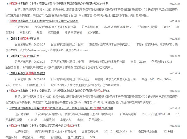 根據(jù)國家市場監(jiān)督管理總局缺陷產(chǎn)品管理中心網(wǎng)站信息公布,沃爾沃在2020年頻繁被召回,沃爾沃曾一度被認(rèn)為非常安全的汽車品牌,雖然車企召回的態(tài)度是非常好的,但是總不能車輛一出廠就有問題,再召回再改正,消費者花了大價錢,以為買了一輛非常安全的車,結(jié)果又是被召回!車輛是馬路上的“老虎”,還望沃爾沃用心做質(zhì)量,少在代言明星上花費大價錢,只有質(zhì)量搞上去了,消費者才會真的買賬!否則只能頻繁降價依舊無人問津!