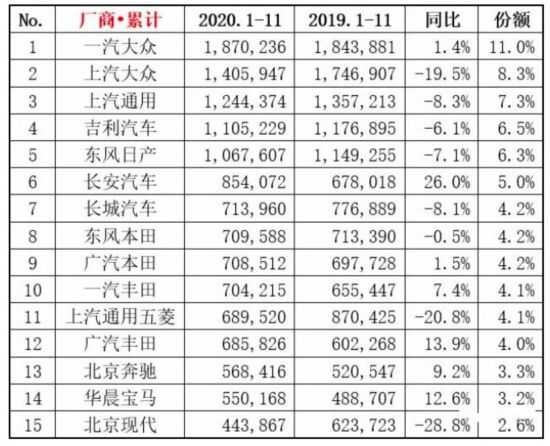 整體來看,穩(wěn)坐銷量前三名的“南北大眾”和上汽通用已提前鎖定年度三強(qiáng),但上汽大眾今年以來跌幅“慘重”,相比去年1-11月,少賣了超34萬輛。相比之下,自主品牌和日系車企表現(xiàn)亮眼。