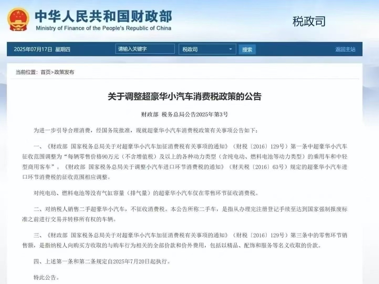 央廣網(wǎng)北京消息(記者董楠)7月17日,財(cái)政部、稅務(wù)總局聯(lián)合發(fā)布公告,對(duì)超豪華小汽車消費(fèi)稅政策作出調(diào)整。此次調(diào)整不僅將征稅門(mén)檻從130萬(wàn)元(不含增值稅)降至90萬(wàn)元,還在征稅環(huán)節(jié)、車型差異、二手車交易等方面做出明確規(guī)范,新政7月20日起正式執(zhí)行。這是2016年我國(guó)對(duì)超豪華小汽車加征消費(fèi)稅后的首次調(diào)整。