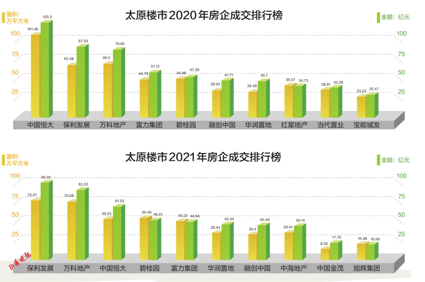 同時(shí),2020年排名第一的中國(guó)恒大,在太原的年銷售額超過(guò)了120億元;2021年排名第一的保利發(fā)展銷售額為95.33億元,沒(méi)有跨過(guò)百億門檻。在成交面積方面,恒大2020年的總銷售面積超過(guò)了100萬(wàn)平方米,而2021年保利發(fā)展的總銷售面積為73.47萬(wàn)平方米,比上一年的銷售面積冠軍縮水了近三成。